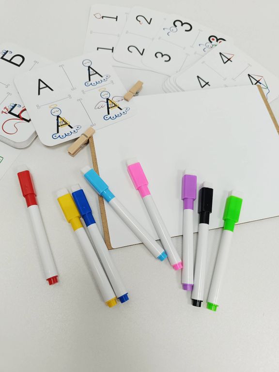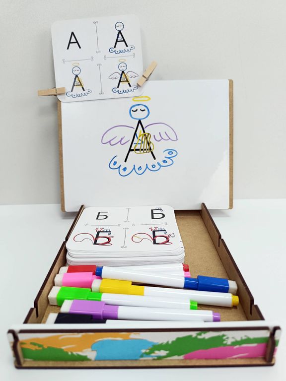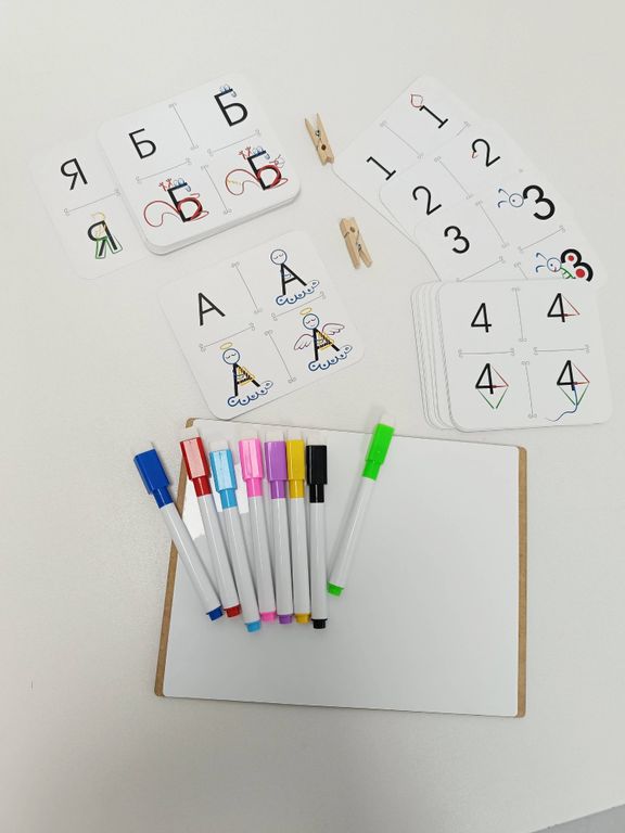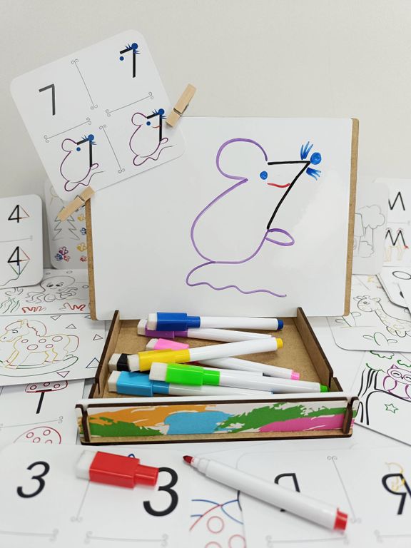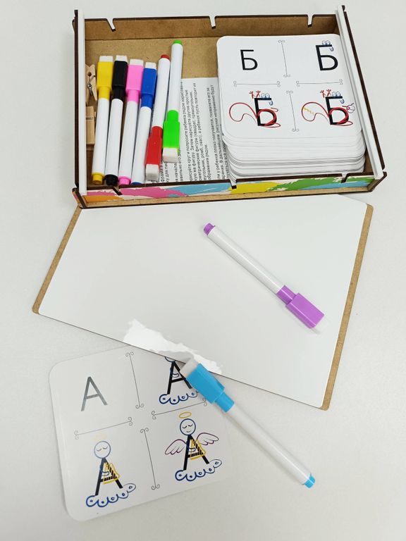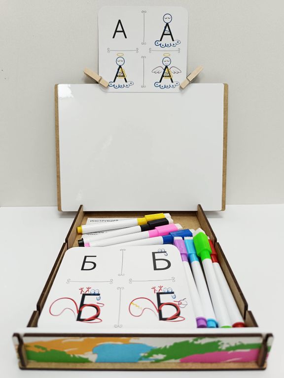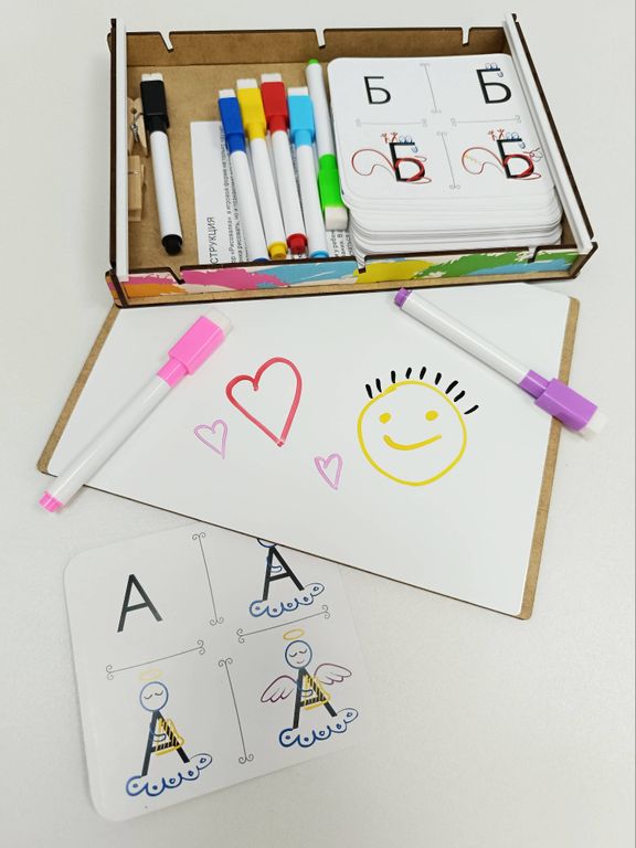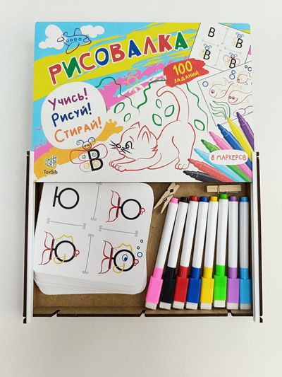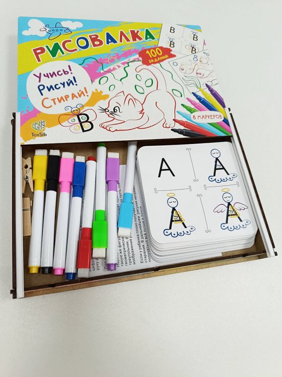 - В комплекте: сундучок с планшетом для рисования на обороте крышки , 50 двусторонних карточек с заданиями, 8 маркеров, 2 прищепки, инструкция