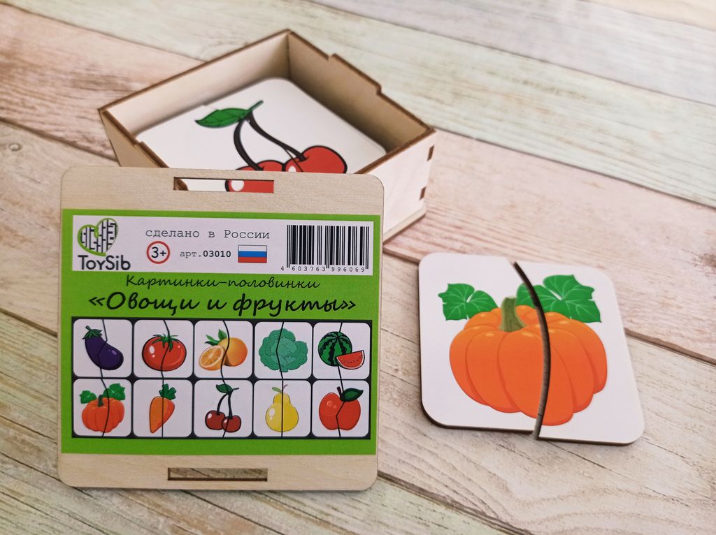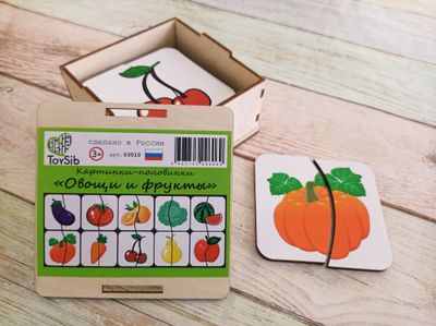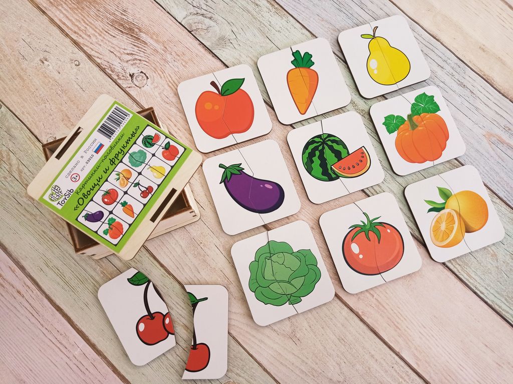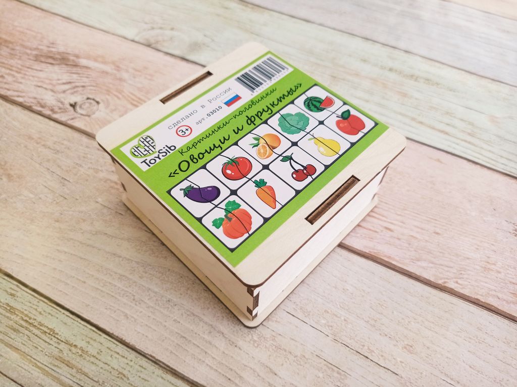 - 10 картинок разных овощей и фруктов в удобном деревянном сундучке для хранения