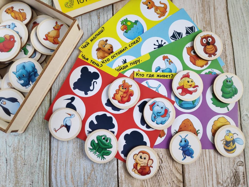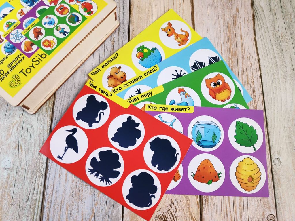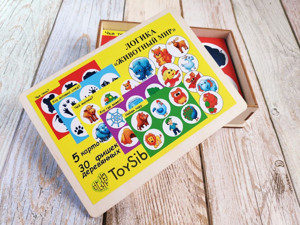 В комплекте: 5 карточек, 30 деревянных фишек, удобный сундучок для хранения
