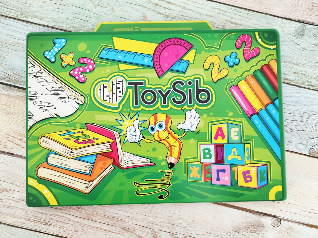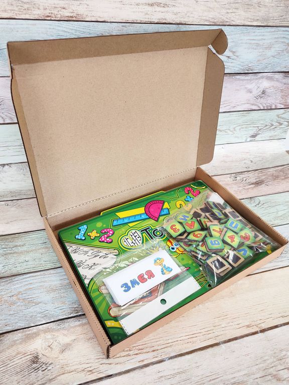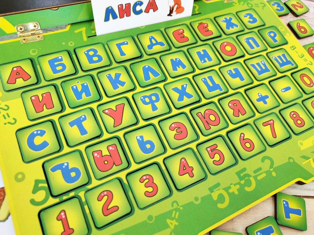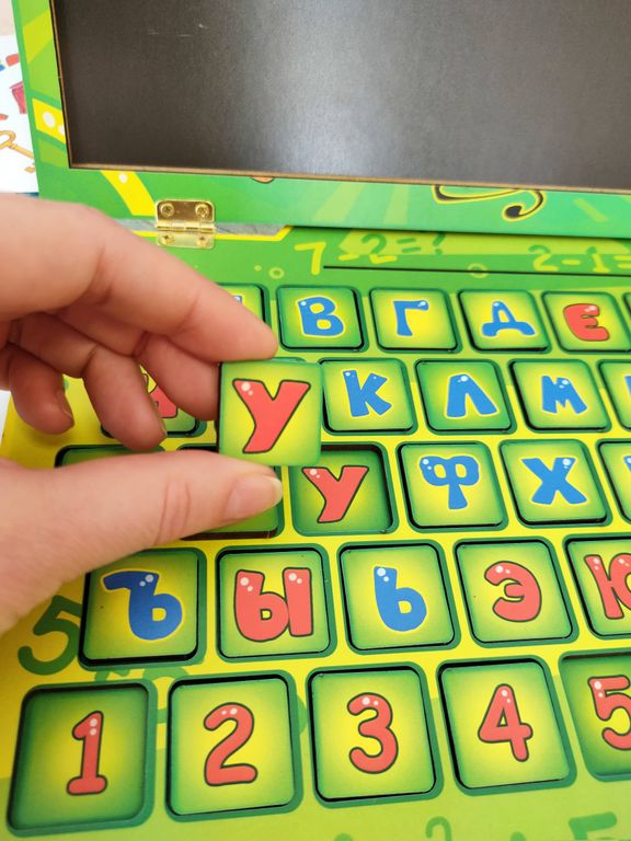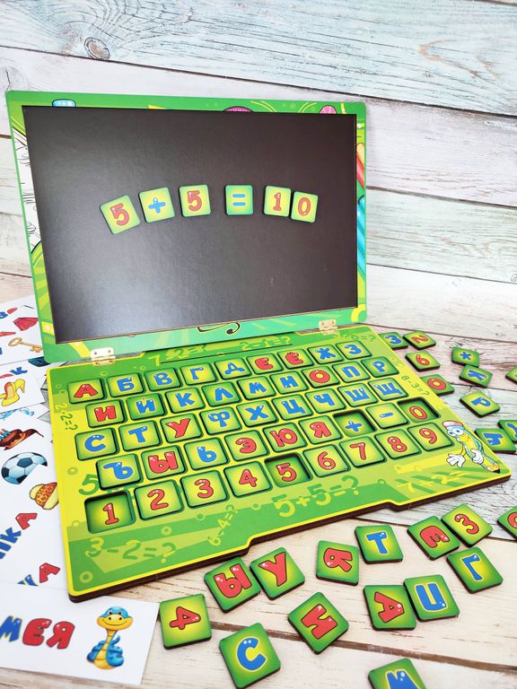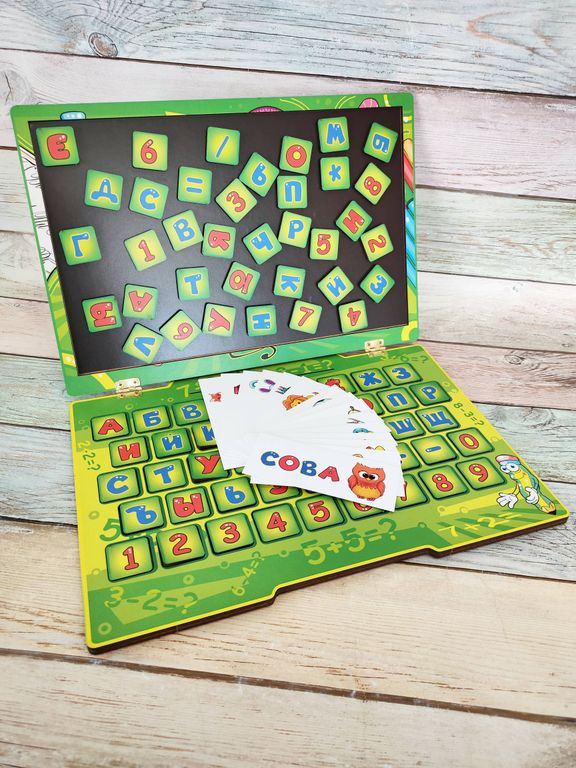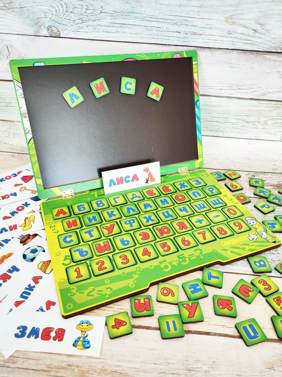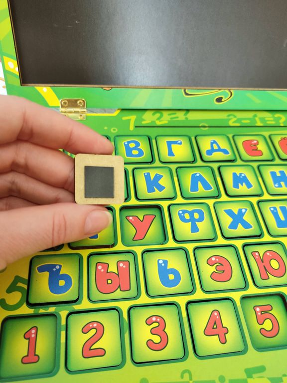 - В комплекте: ноутбук с магнитным дисплеем, 15 двусторонних карточек с заданиями, 81 клавиша, коробка для хранения