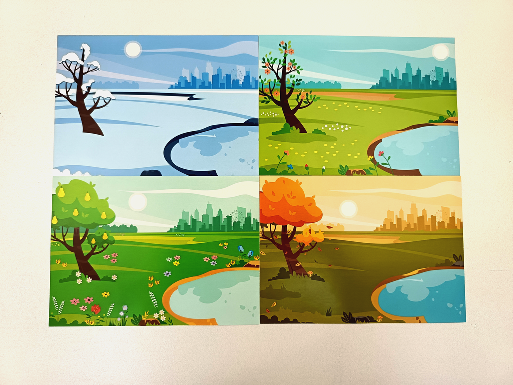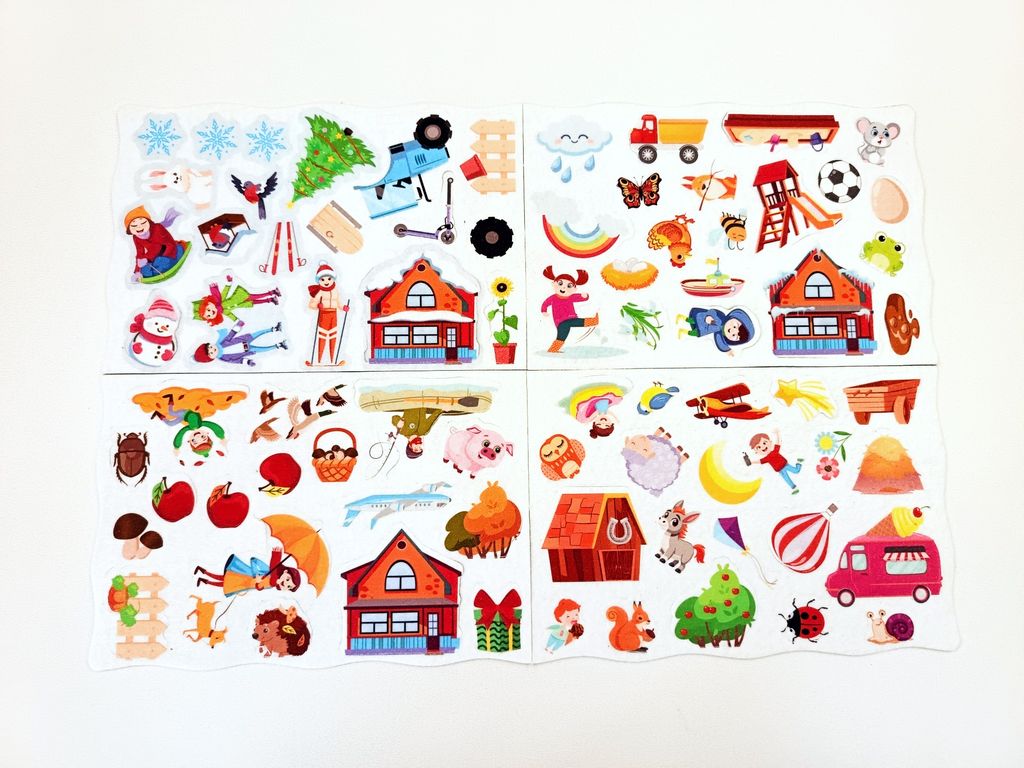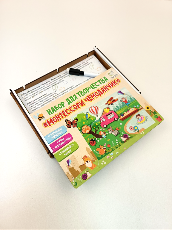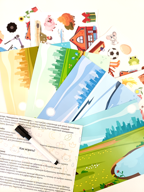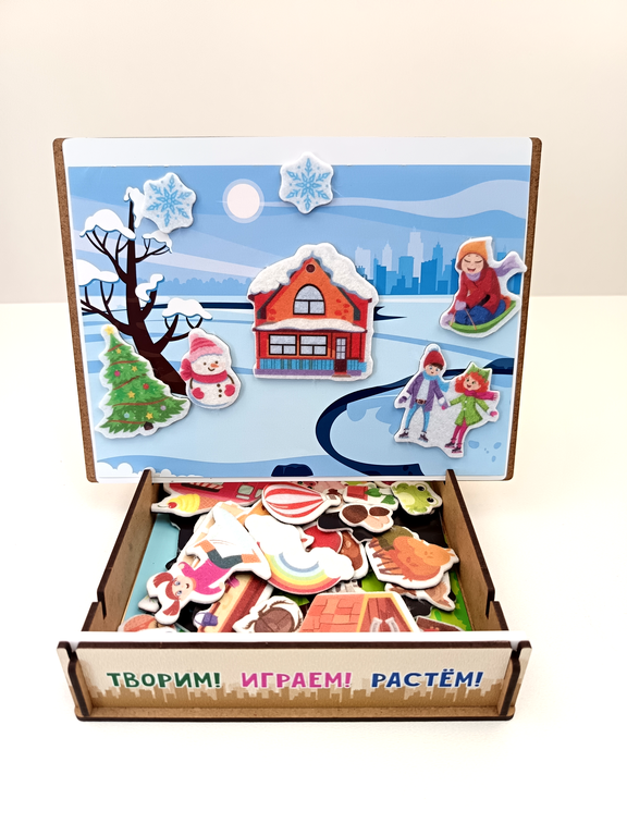 - В комплекте: сундучок с планшетом для рисования на обороте крышки, 77 фетровых элементов на магнитной основе, 4 фона с временами года, 1 маркер, инструкция