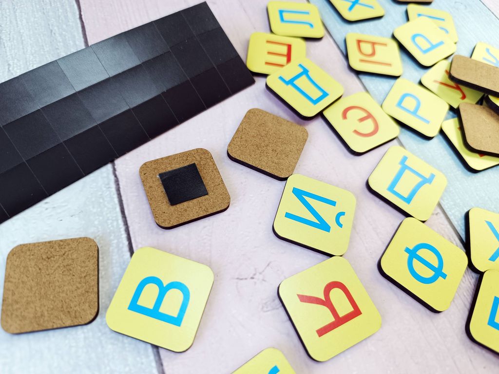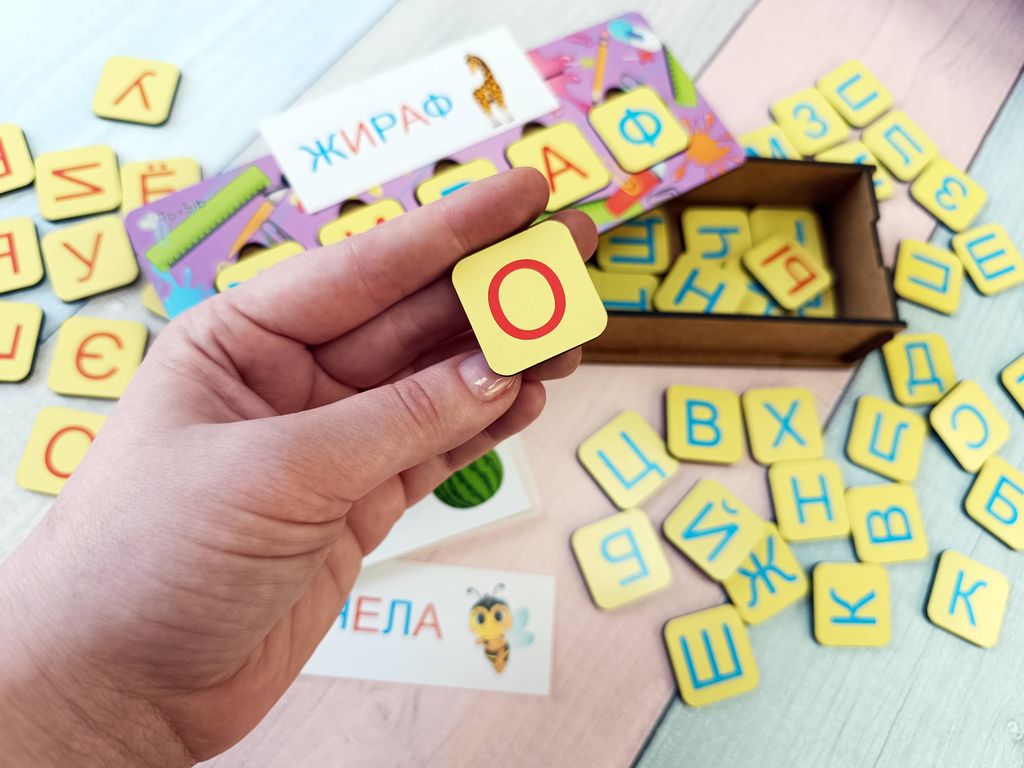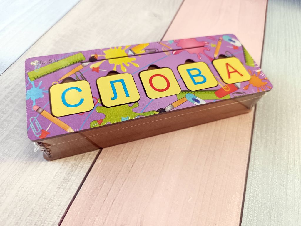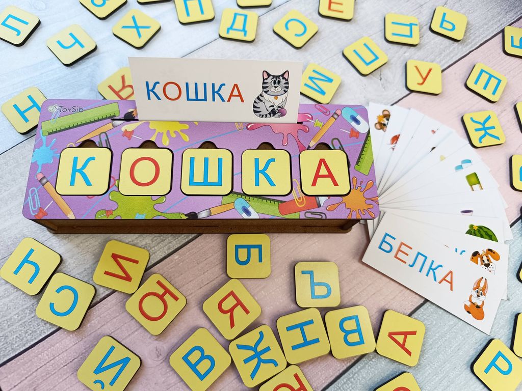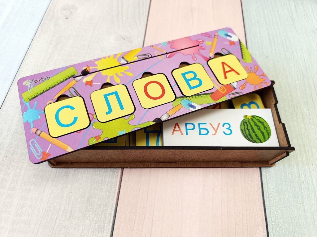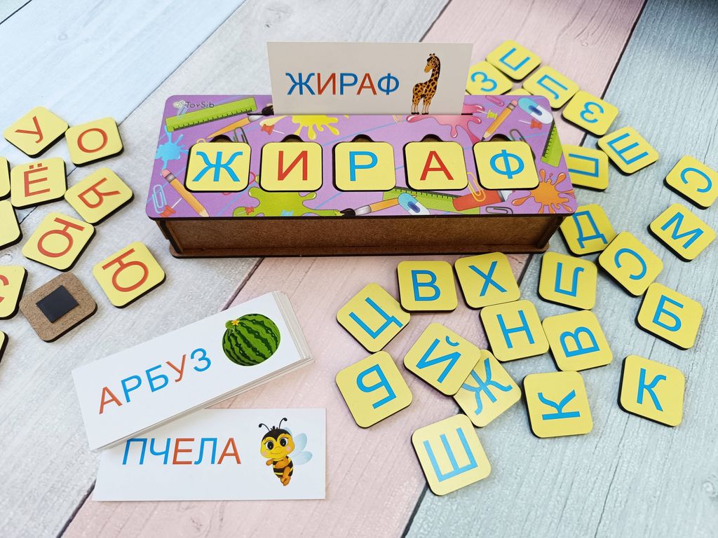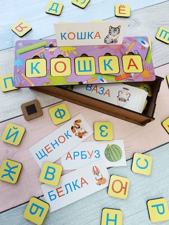 - В комплекте: сундучок с игровой панелью на крышечке, 15 двусторонних карточек с заданиями, 58 деревянных фишек с изображением букв, магнитный винил для крепления фишек к металлической поверхности