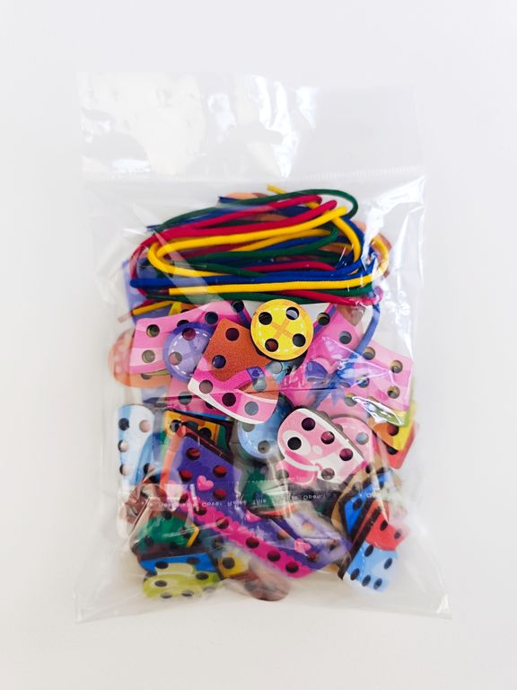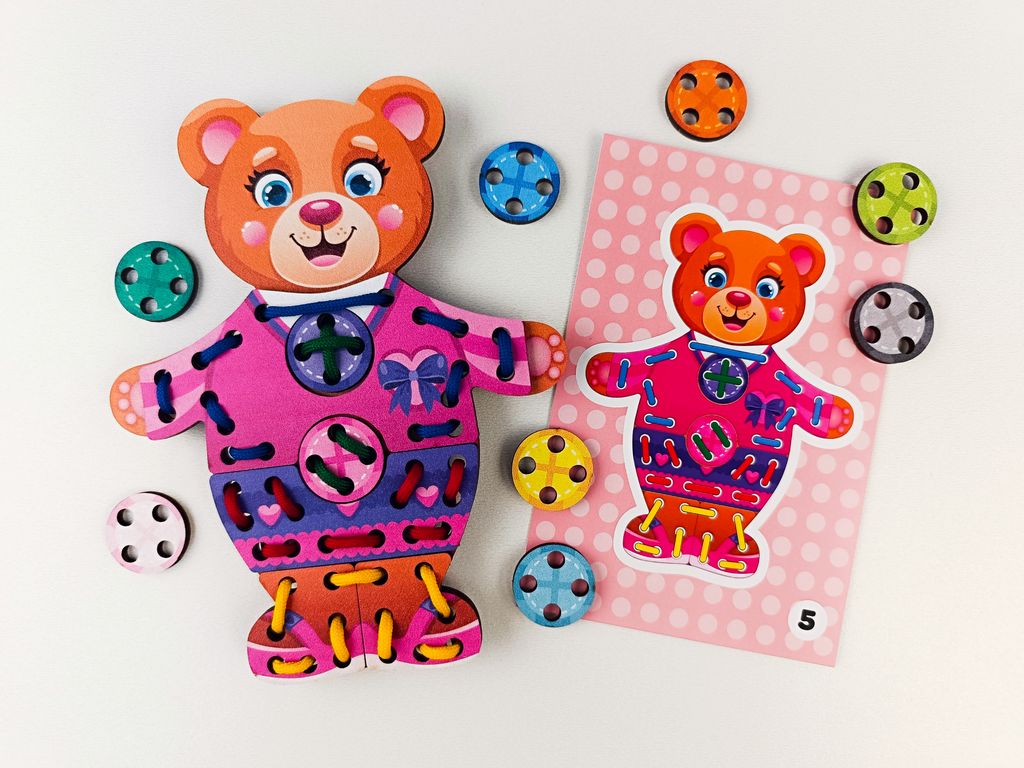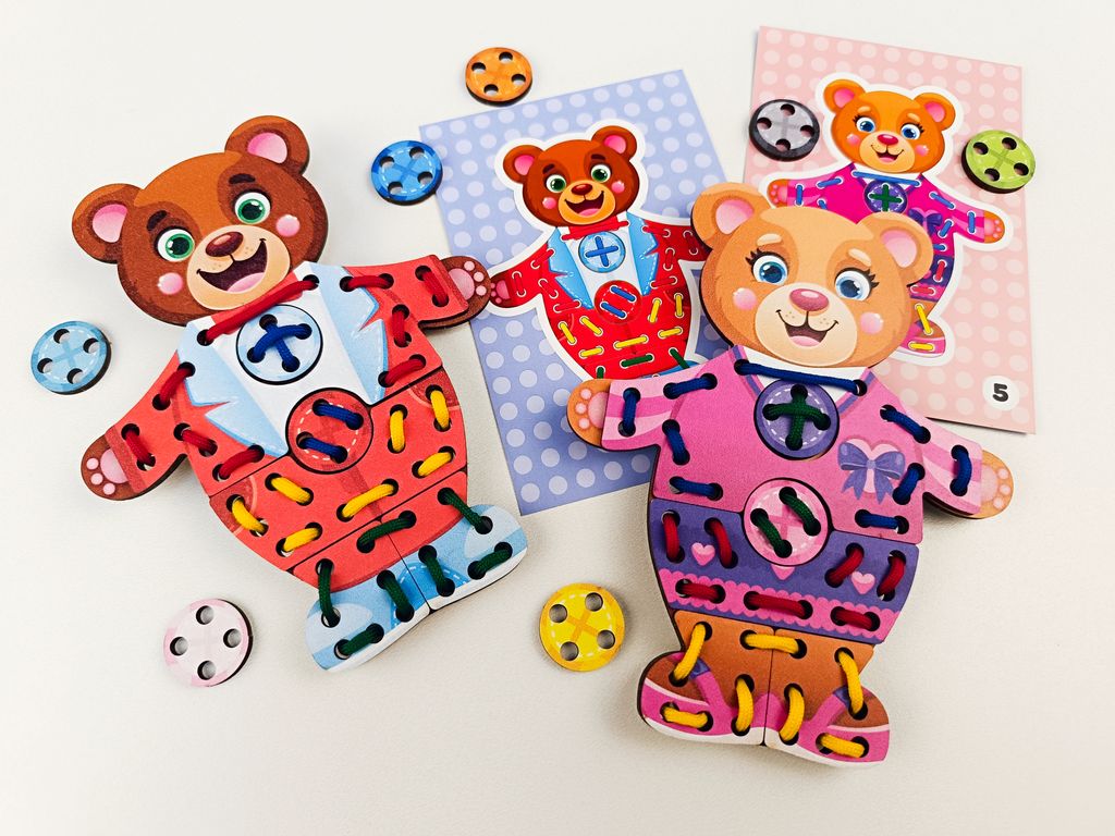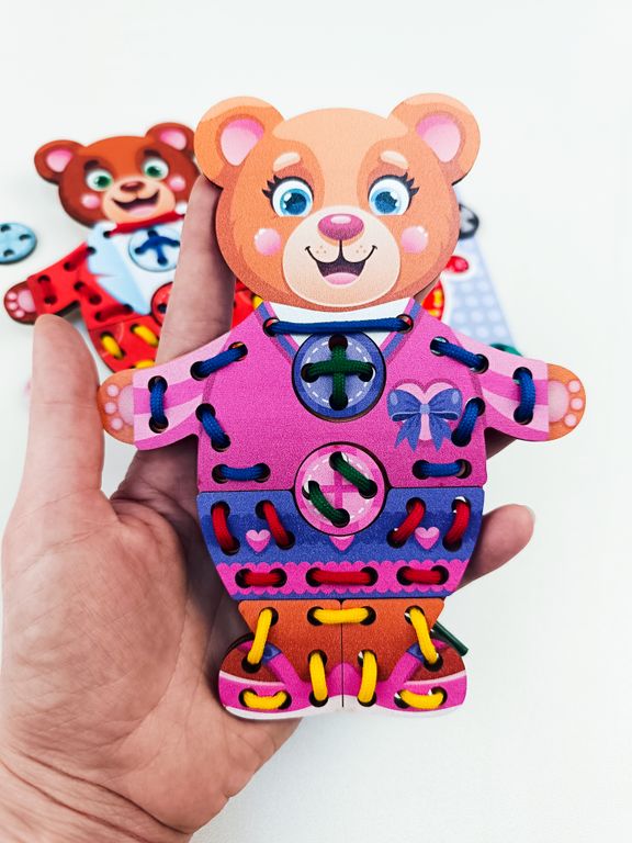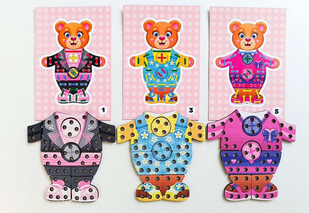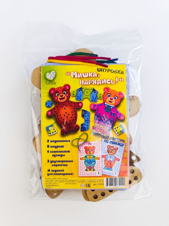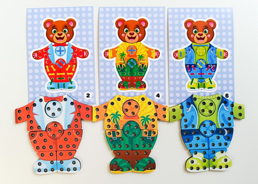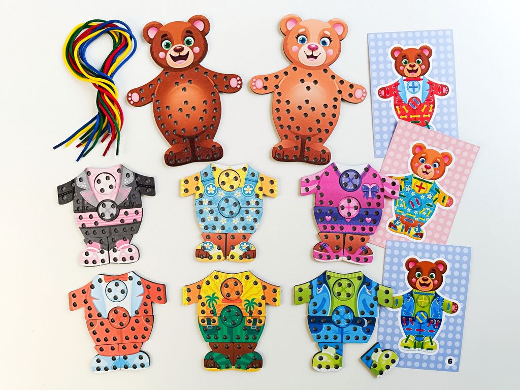 - В комплекте: 2 медвежонка, 6 комплектов одежды, 8 шнурков, 3 двусторонние карточки (6 заданий для повторения).