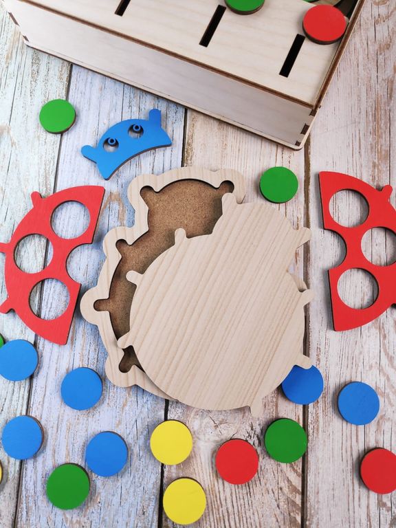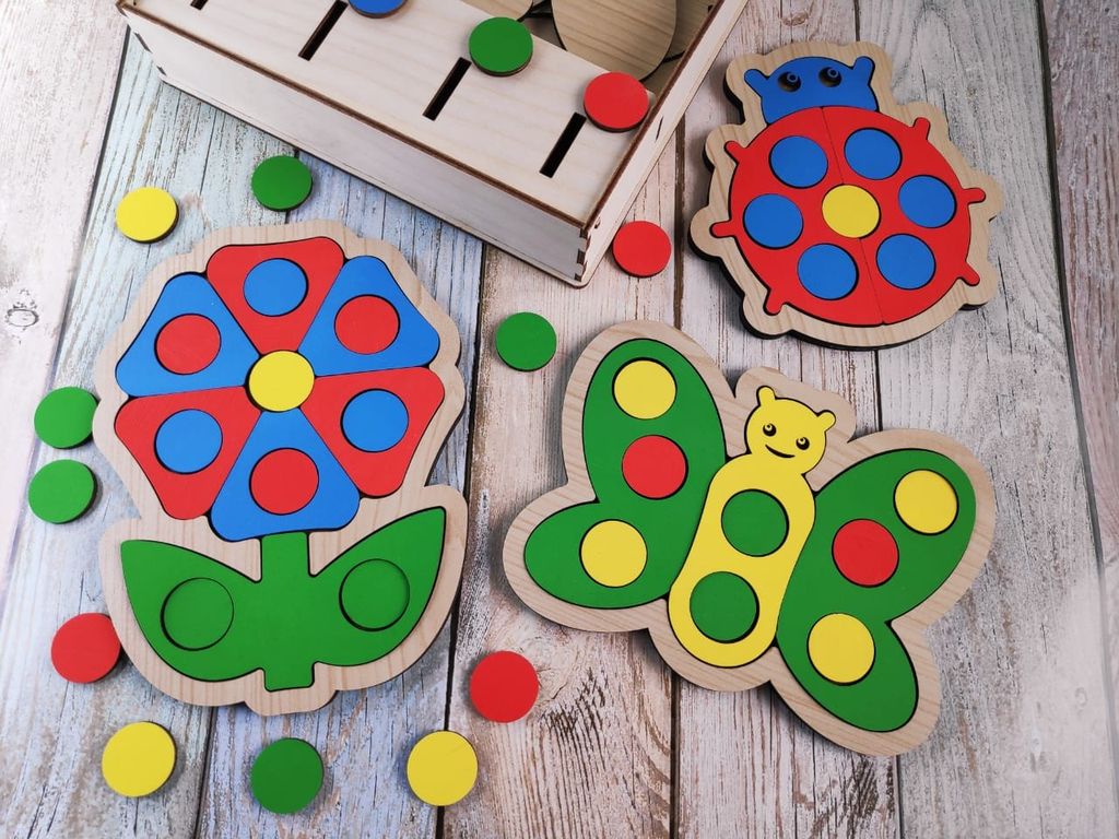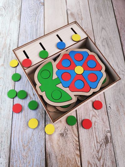 - В комплекте: сортер, 3 рамки, 3 одноцветных вкладыша, 3 набора цветных элементов пазла, 40 кружочков (10 штук каждого цвета)